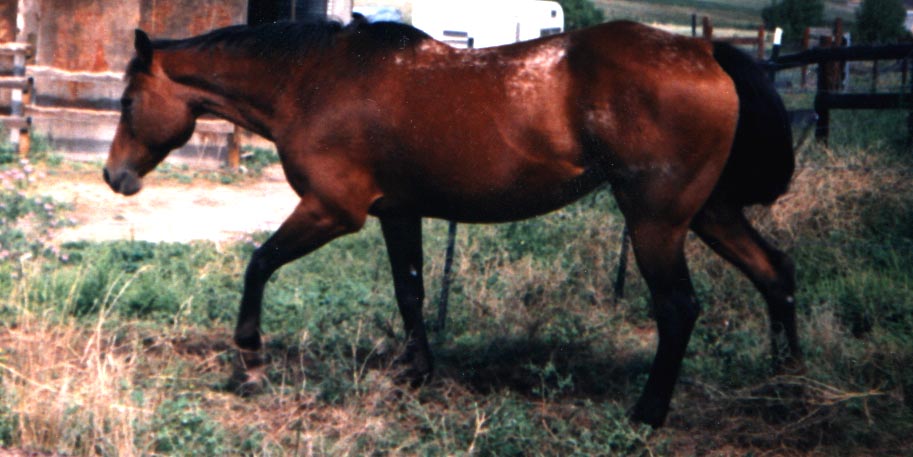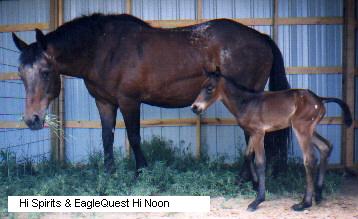 EagleQuest Hi Spirits Shown here with her newborn 2001 colt EagleQuest Hi Noon. Nooner was sired by the Morgan stallion Osirus and was Spirit's first foal. |