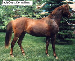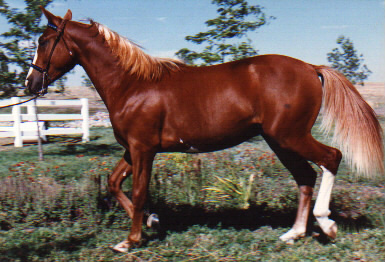 EagleQuest Mozelle Gorgeous, gaited, and a filly! What more could you ask for? How about a puppy dog disposition and an unusual very light sandy bay color! Currently 3 yrs old, Mozie is in training and will be added to the broodmare band next year. (Caduceus Moses X LSR Four Roses) |