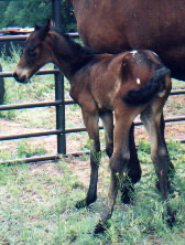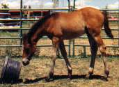 | Elnora's Smokie Joe Joey is a pretty bright bay with just a touch of white. His sire was the Canadian National Champion Reining Horse in 1998. He was sold in utero and now resides in sunny southern California. (Truwest Pure Prairie Smoke X LSR Four Roses) |
