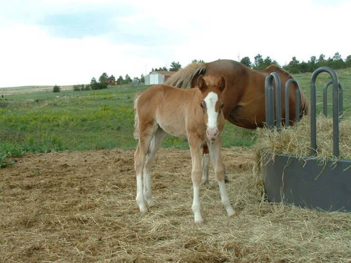 EagleQuest DeHavilland "Brutus" was nicknamed for his enormous size. The biggest of the lot, this colt was standing nearly 15 hands as a yearling. Shown here at 2 years old, you can see what we're talking about. Brutus has a handsome face, big hip, and is very gaited. In fact, he almost never trots! This easy going colt sold at 9 days old to Mike & Cassie Linder of Arvada, Colorado. (Osirus X LSR Four Roses) |